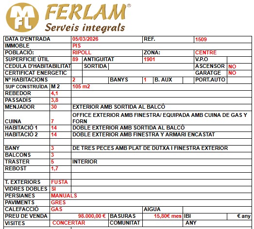 Se presenta este piso con gran potencial situado en Ripoll, ideal para quienes buscan una vivienda con carácter y la posibilidad de adaptarla completamente a su estilo. Con una superficie construida aproximada de 108 m² según catastro, la vivienda ofrece una base excelente para crear un hogar cómodo, luminoso y funcional.